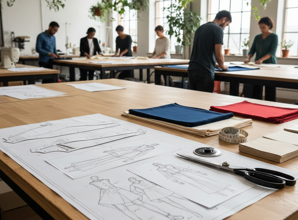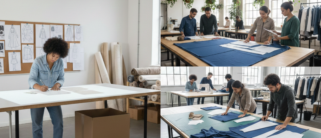 Concrètement, que se passe-t-il entre le moment où un modèle est imaginé et celui où il arrive dans votre dressing ? Le processus suit plusieurs grandes étapes, toutes traçables. D’abord, la création : choix des matières (coton bio, lin, fibres recyclées), élaboration des patronages, mise au point des prototypes. Ensuite, la gradation en différentes tailles et la préparation des plans de coupe.