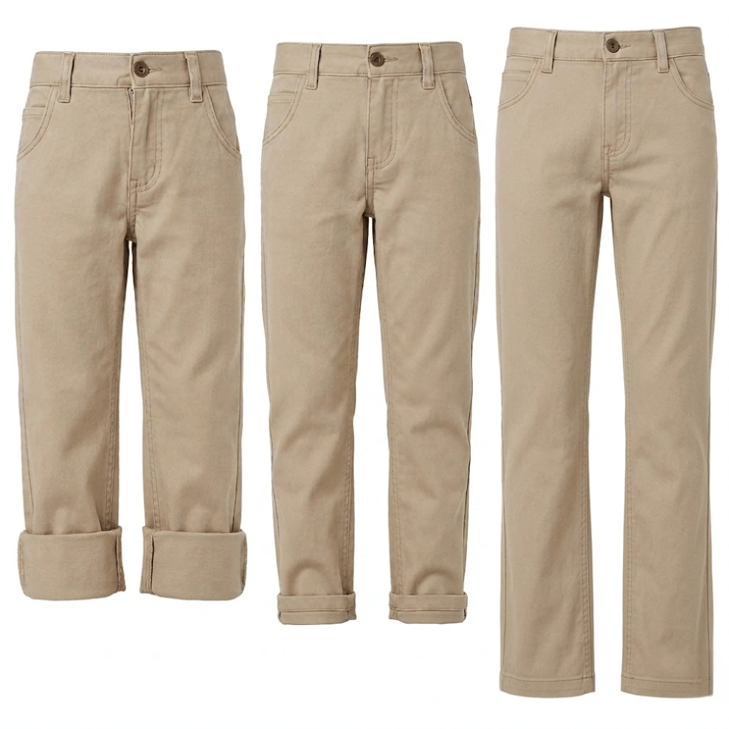 Pour les 6-10 ans, déroulez partiellement les revers pour rallonger le pantalon progressivement au fur et à mesure de la croissance. Ensuite, pour les 11-16 ans, déroulez complètement les revers pour la longueur maximale adaptée aux adolescents. Ainsi, un seul pantalon accompagne votre enfant sur plus de 10 ans de croissance.