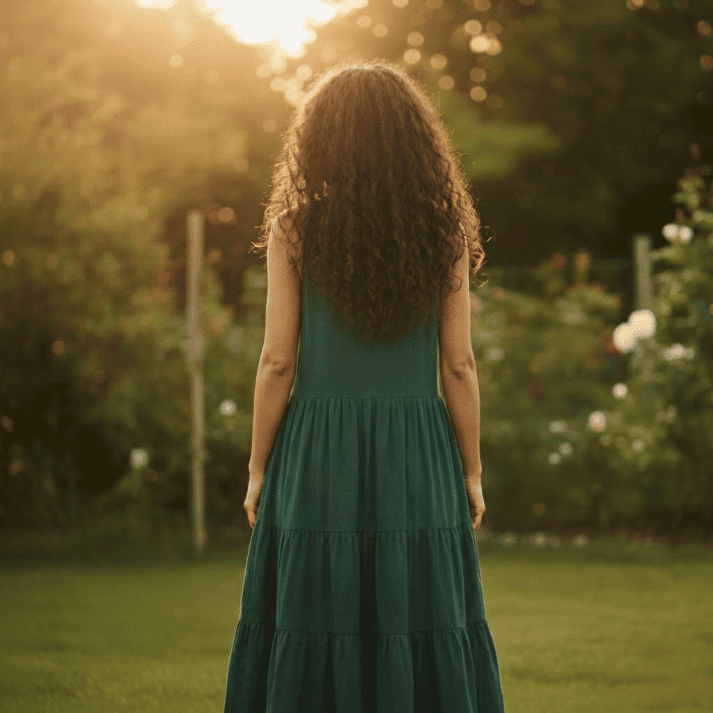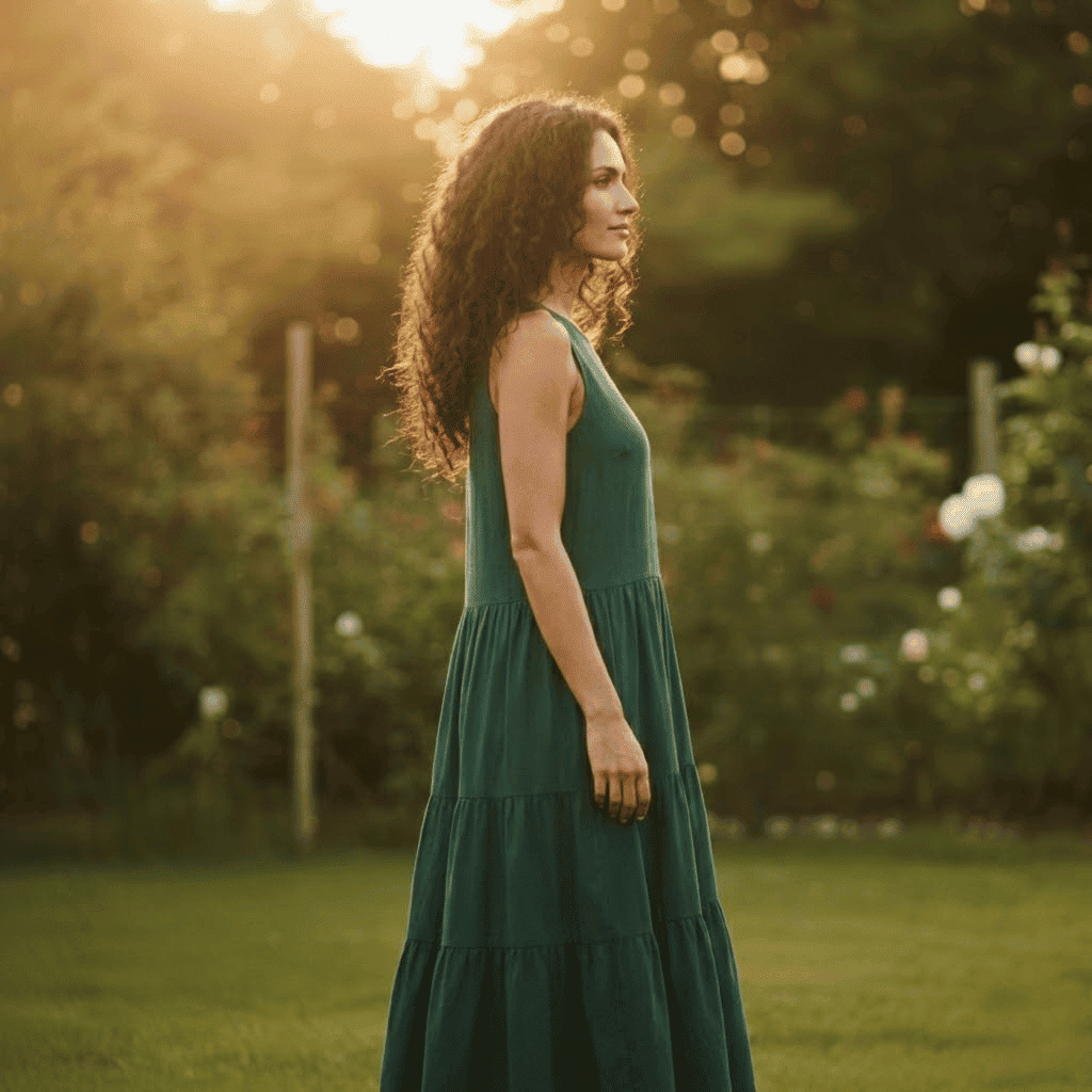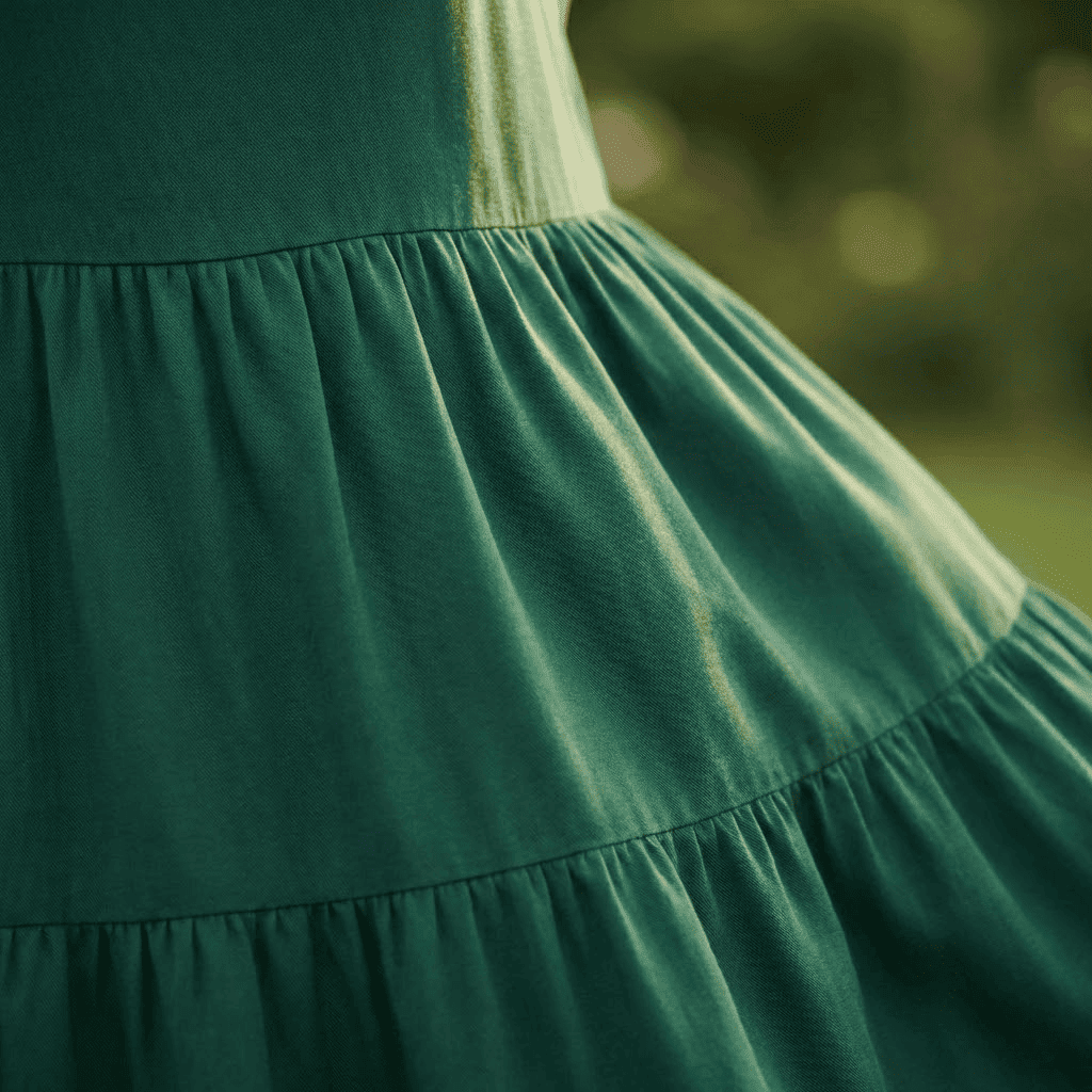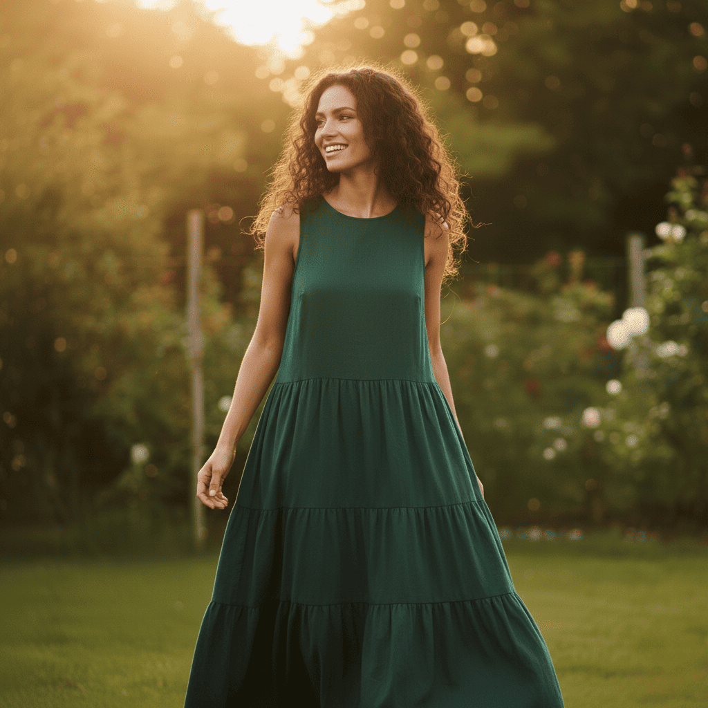 La couleur vert sapin profond apporte une sophistication bohème à votre look. Elle se marie parfaitement avec des accessoires en bois, cuir naturel ou dorés. Les volants superposés créent une dynamique visuelle captivante qui fait toute la magie de cette robe.