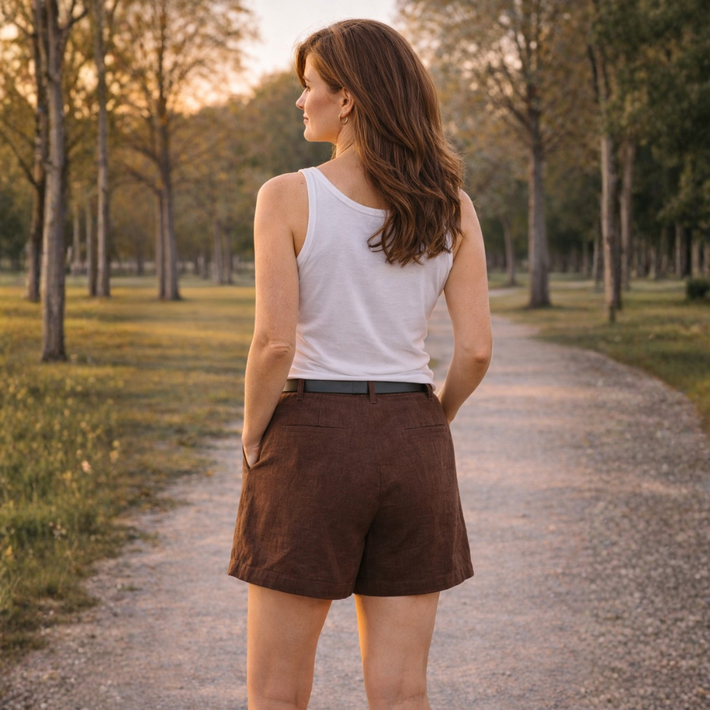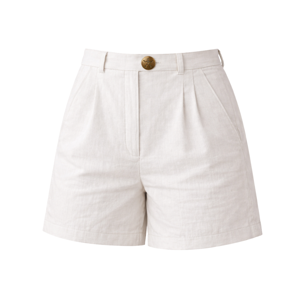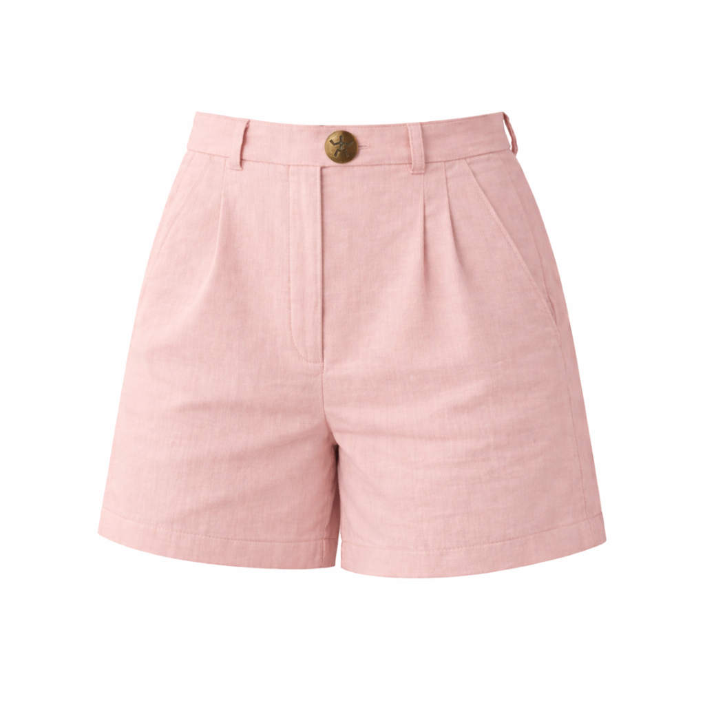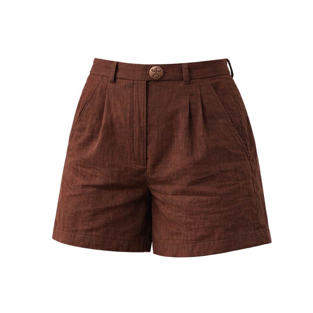 Short femme en lin naturel léger. Disponible en marron, blanc et rose poudré. Fraîcheur estivale et confort respirant. Fabrication éthique pour un été responsable.