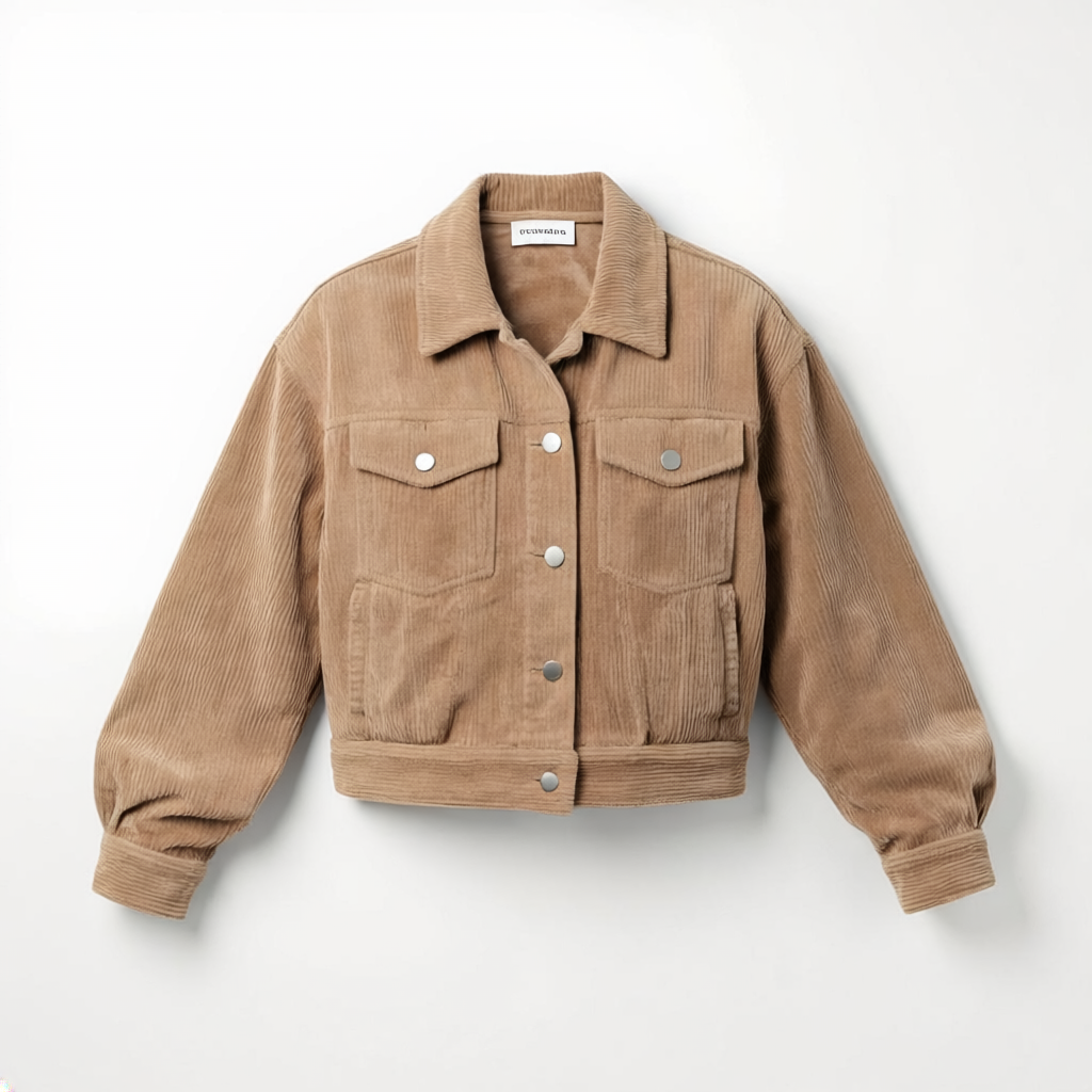 Veste femme en laine responsable beige à texture velours côtelé. Coupe courte ajustée style vintage avec poches à rabat et boutons dorés. Chaleur naturelle et fabrication éthique pour un look intemporel.