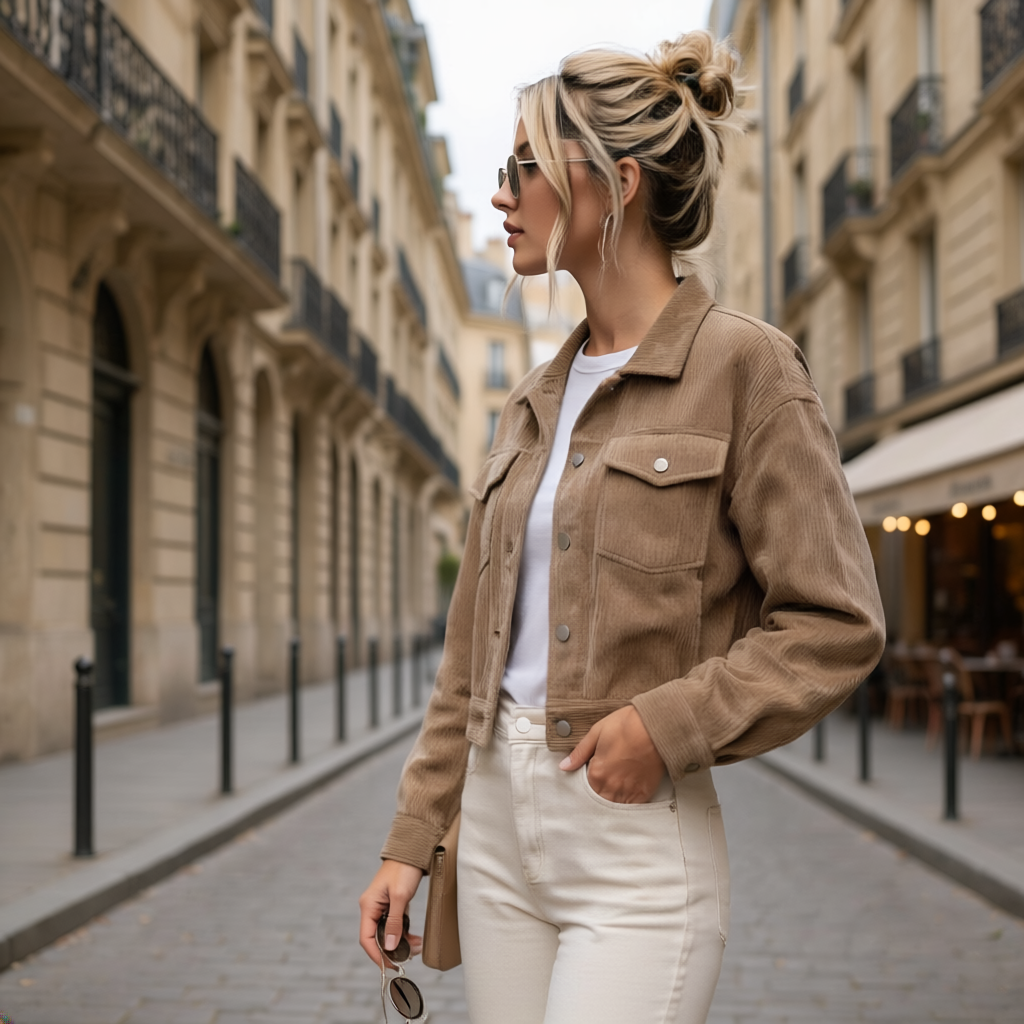 Pour un style plus habillé, associez-la à une jupe midi beige et des bottines à talons. Enfin, la veste se porte aussi bien au bureau qu’en soirée, du lundi au samedi avec polyvalence totale.